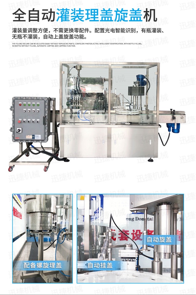 全自動(dòng)凝膠生產(chǎn)線適用于消毒凝膠、免洗手洗手液、免洗手消毒凝膠、消毒液、84消毒液、醫(yī)用酒精、75%酒精消毒液、75度酒精、消毒水、殺菌消毒劑、醫(yī)用酒精、碘酒、次氯酸鈉、劑、醫(yī)用乙醇消毒液、瓶裝消毒劑等產(chǎn)品,有多頭全自動(dòng)消毒液灌裝機(jī)和封箱機(jī)、貼標(biāo)機(jī)、打包機(jī)、噴碼機(jī)等配套設(shè)備組成,實(shí)現(xiàn)消毒液自動(dòng)灌裝,自動(dòng)旋蓋,自動(dòng)貼標(biāo),從灌裝、到成品的全部過(guò)程
