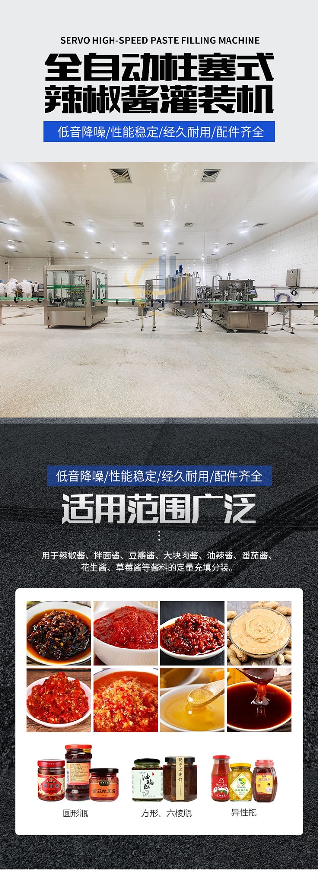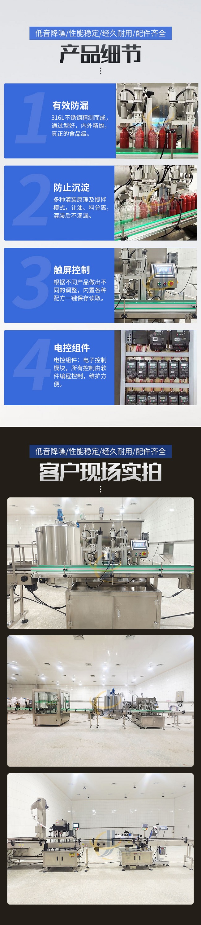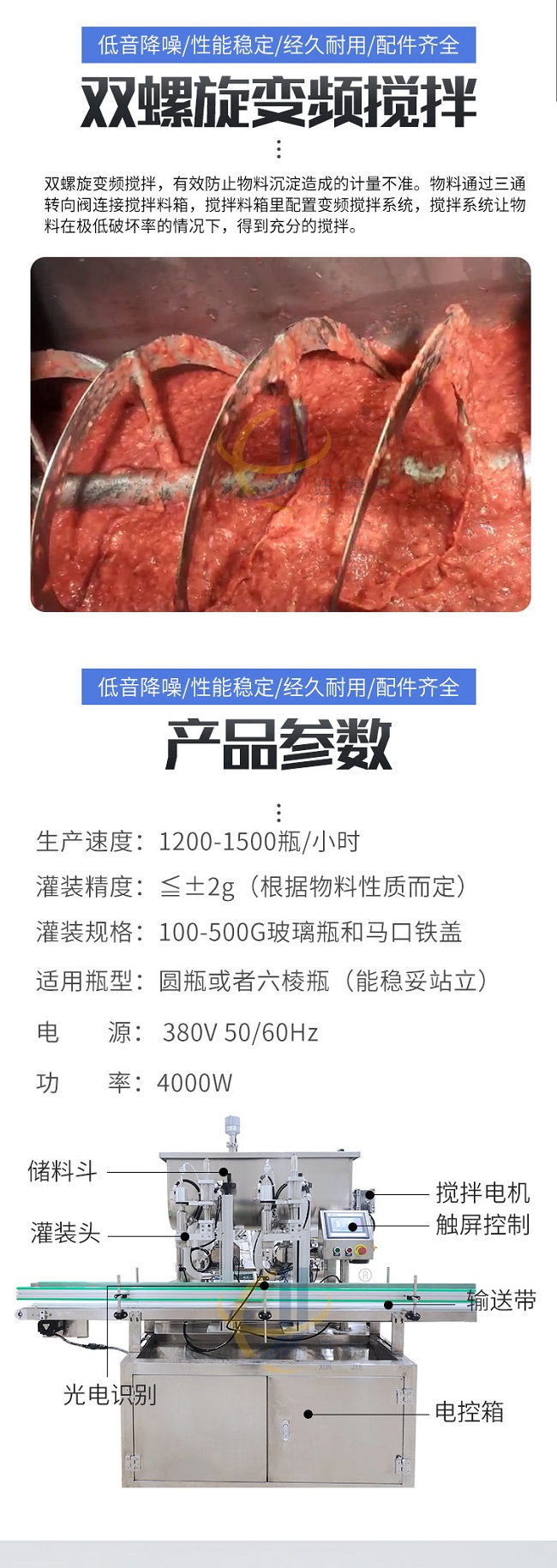 這款柱塞式辣椒醬灌裝機低音降噪、性能穩(wěn)定、經(jīng)久耐用、配件齊全,適用范圍廣泛用于辣椒醬、拌面醬、豆瓣醬、大塊肉醬、油辣醬、番茄醬花生醬、草莓醬等醬料的定量充填分裝。雙螺旋變頻攪拌,有效防止物料沉淀造成的計量不準。物料通過三通轉向閥連接攪拌料箱,攪拌料箱里配置變頻攪拌系統(tǒng),攪拌系統(tǒng)讓物料在極低破壞率的情況下,得到充分的攪拌。